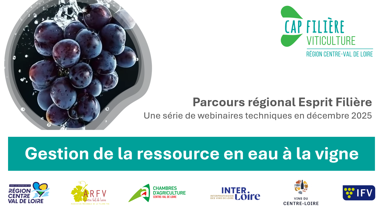 Dans le cadre du CAP filière Viticulture, l' Association Régionale Filière Vin Centre Val de Loire (ARFV) vous propose une série de  3 webinaires dédiés à la gestion de la ressource en eau à la vigne.