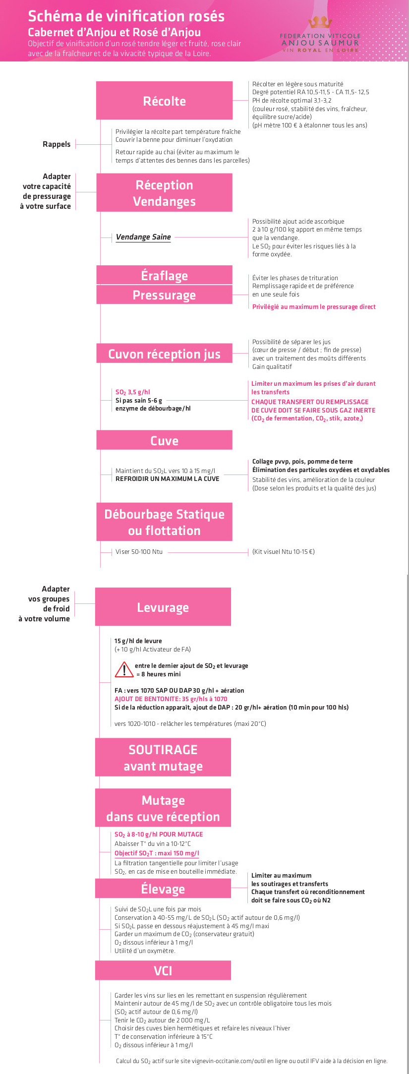 La section des rosés de la Fédération des Vins Anjou-Saumur propose un nuancier des couleurs de rosé créer par l'IFV ainsi qu'un schéma de vinification des vins rosés. « En effet, la couleur du vin rosé est le premier critère déclenchant l'acte d'achat chez les consommateurs et la couleur est très souvent le reflet de la palette aromatique du produit », expliquent Pierre-Antoine Pinet, Président des AOC Cabernet d’Anjou et Rosé d’Anjou et Jean-Marie Gazeau, Président de l’AOC Rosé de Loire. Suite aux travaux menés avec l’ASSVAS, les syndicats ont souhaité faire évoluer la fiche dégustation des contrôles produits des rosés de l’Anjou : afin de simplifier la dégustation, il est ainsi proposé une nouvelle méthode pour juger la couleur sur la base de ce nuancier.