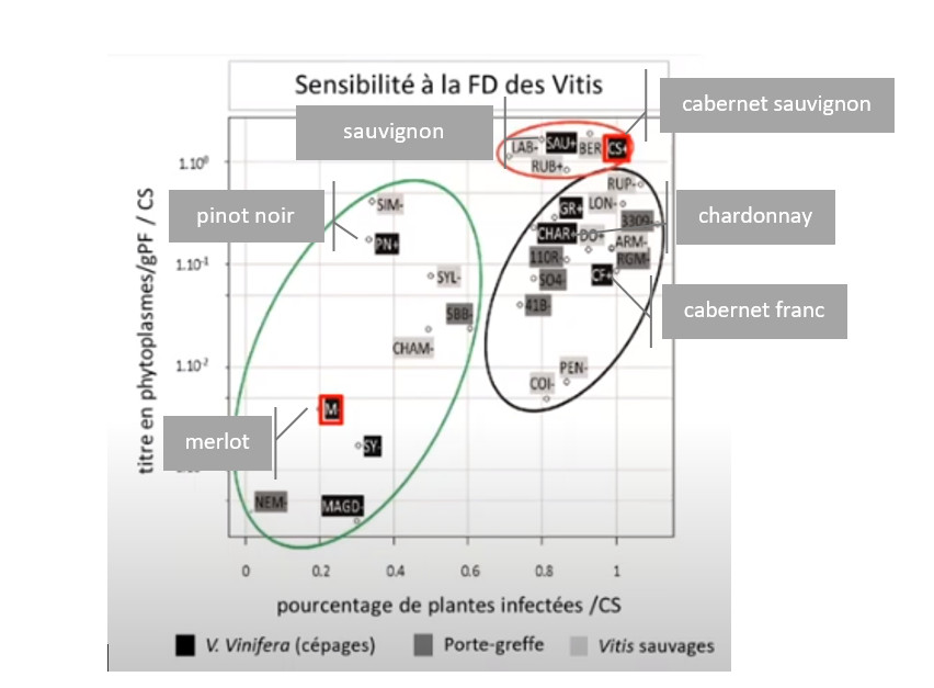 Les paramètres influençant la probabilité d’une parcelle d’être infectée par la flavescence dorée ont été étudiés dans le projet CoAct. Le facteur cépage a été mis en exergue. Ainsi une parcelle de sauvignon a plus de probabilité d’être infectée par la flavescence dorée qu’une parcelle de cabernet franc. « L’étude génétique de la sensibilité des cépages met en avant un déterminisme génétique du caractère sensible. La suite du projet visera à poursuivre la caractérisation de la sensibilité de cépages régionaux et à mettre en conservatoire les descendants peu sensibles obtenus dans les croisements réalisés », annonce Sylvie Malembic-Maher de l’INRAE. L’environnement paysagé est aussi montré comme un facteur à risque. Ainsi, une parcelle située dans un environnement urbain ou de forêt a plus de probabilité d’être infectée qu’une parcelle placée dans un environnement de vigne ou de cépages peu sensibles. A noter que c’est l’environnement proche, dans un rayon de 100 m autour de la parcelle, qui influe sur la probabilité d’infection.