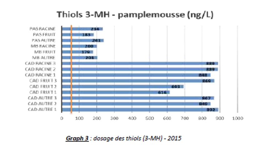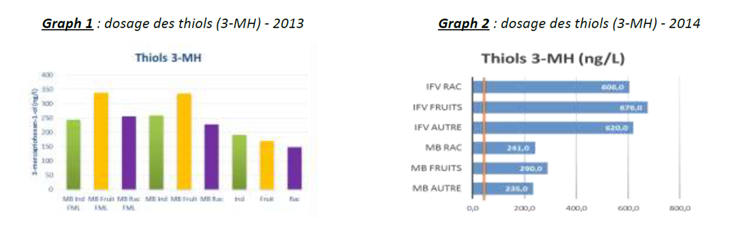 Sur les millésimes 2013 et 2014, les bâtonnages en jours fruits semblent avoir davantage développé les thiols. Par contre, l’évaluation sensorielle par un jury de professionnels du vin, révèle des résultats contradictoires qui ne confirment pas les différences obtenues dans les dosages aromatiques. Sur le millésime 2015 on ne retrouve pas ce surcroit de 3-MH dans les modalités « jours fruits ». On observe même un effet inverse avec « jours fruits » en léger retrait sur les vins des 3 essais.