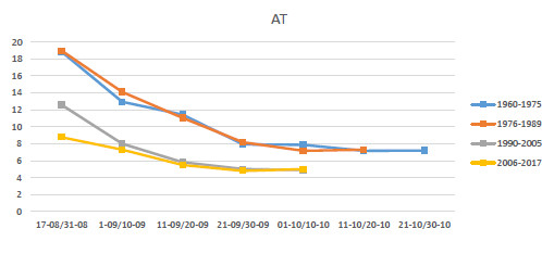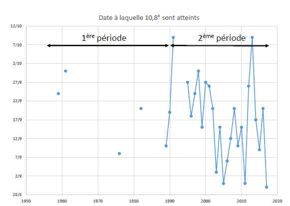 L’étude a porté sur la comparaison de deux périodes de 29 ans : 1959-1988 et 1989-2017. Depuis 1959, le laboratoire de Touraine effectue des analyses de maturité hebdomadaires sur des raisins de cabernet franc prélevés sur un réseau de parcelles localisées à Chinon, Bourgueil et Saint-Nicolas-de-Bourgueil. L’analyse des moyennes des degrés montre que 10.8 % vol. sont atteints pour quatre années sur la première période puis tous les ans depuis 30 ans. « Sur cette deuxième période, il est aussi intéressant de relever que ces 10.8 % vol. sont atteints de plus en plus tôt : le 13 septembre en 1989, le 18 septembre en 1996, le 3 septembre en 2003 et le 31 août en 2005 et 2011 », souligne Guillaume Delanoue.