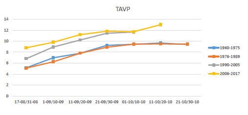 Dans l’hypothèse où la date de vendange correspond à +/- 7 jours après la date de la dernière analyse enregistrée par le Laboratoire Touraine (analyse hebdomadaire), les données mettent en avant une nette avancée de la date des vendanges de cabernet franc : de fin octobre au début des années 1960 à fin septembre début des années 2010 avec un écart de 48 jours entre les extrêmes (1963 et 2003). A date équivalente, on note une augmentation de +3.5 °degré sur 58 ans et une baisse de 2.5 point d’acidité totale.