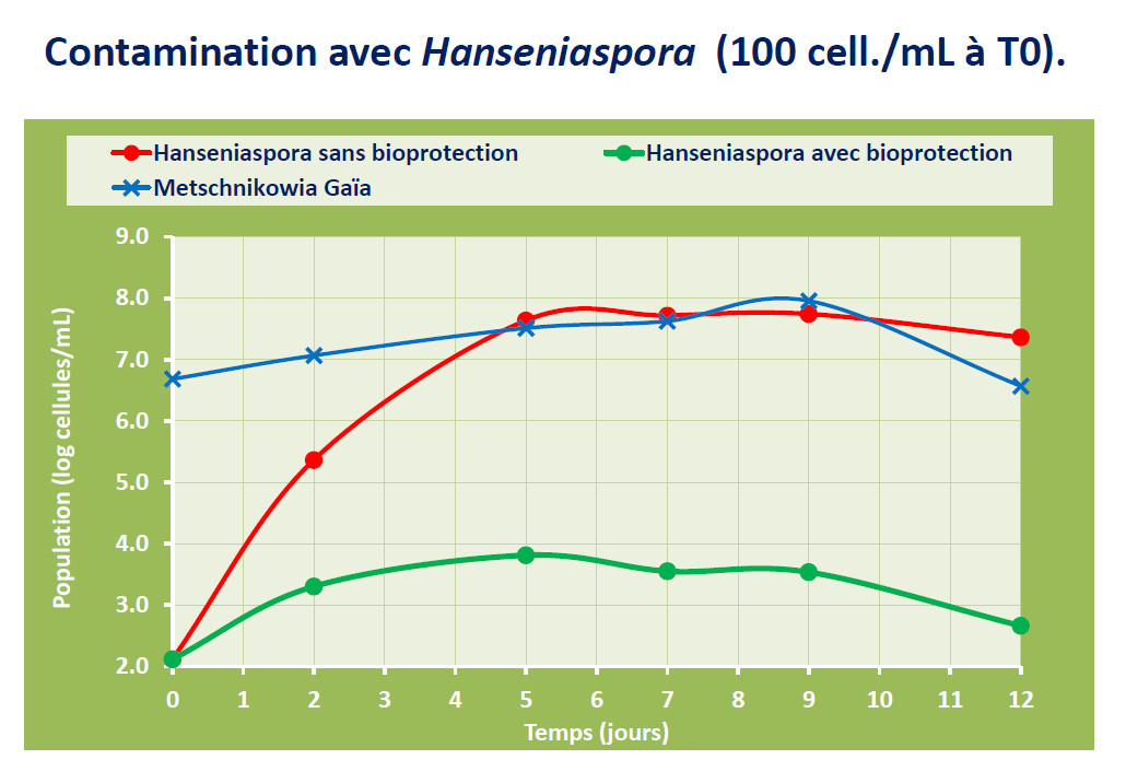 Les travaux ont montré que plus la dose est élevée plus la bioprotection est efficace. Il a aussi été observé que cette levure est capable de s’implanter et survivre pendant au moins 80 jours dans un moût à 0°C. La température est un levier-clé en bioprotection : plus on travaille à basse température, plus M. fructicola est avantagée par rapport aux S.cerevisae indigènes. Cette souche est produite sous forme de levure sèche active et commercialisée par IOC sous le nom de Gaïa. Il existe d’autres produits de bioprotection sur le marché comme Nova chez CHR Hansen, Primaflora chez Immelé,…. Mais n’oublions pas que la bioprotection n’a pas ou peu d’action anti-oxydante et qu’il faut être prudent notamment sur des cépages aromatiques comme le sauvignon.