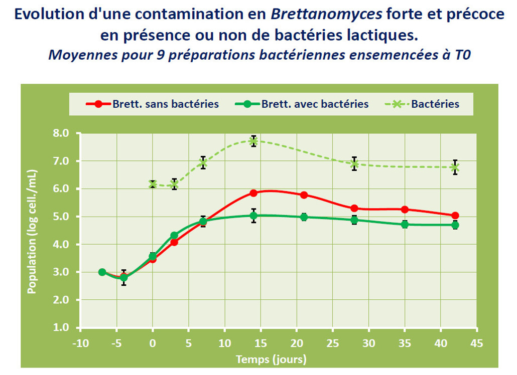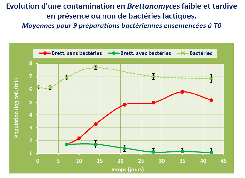 Chacun sait que la phase entre la fin de la fermentation alcoolique et le début de la fermentation malolactique (FML) est une période délicate du fait de l’instabilité du milieu et du risque de développement des Brettanomyces. Pour limiter son développement et celui des phénols volatils, la maitrise de la FML avec un ensemencement de bactéries lactiques puis le sulfitage durant l’élevage sont de mise. Mais selon les souches de Brettanomyces, la résistance au SO2 peut être importante, limitant son efficacité tout comme l’augmentation des pH des vins ou la réduction des doses employées. Or les bactéries lactiques peuvent inhiber ces levures de manière plus ou moins efficace selon le niveau de contamination. Le maintien de la présence bactérienne après FML s’avère un bon moyen de maîtrise de cette flore indésirable pour les vins parfaitement secs.