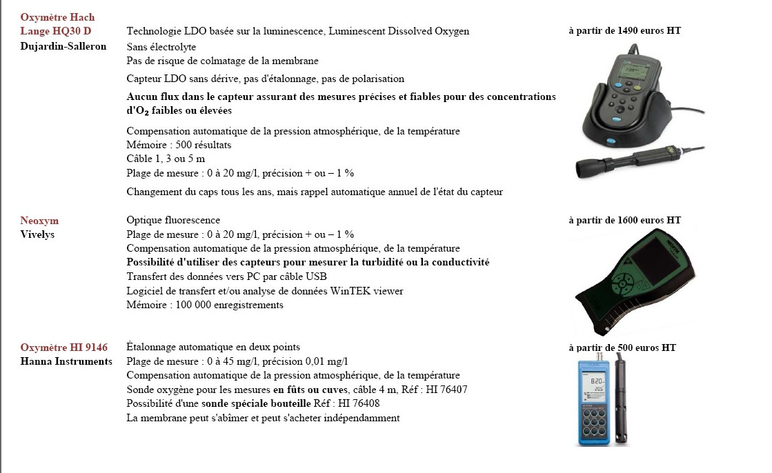 L’utilisation d’un oxymètre est simple mais l’interprétation des résultats nécessite l’élaboration d’un historique de travail. On trouve dans la littérature des fourchettes de valeur de dioxygène qui peuvent se dissoudre à chaque opération. Il est nécessaire que le vigneron fasse des mesures pour se créer un historique, un référentiel et personnalise son mode opératoire. Les conditions de mesures doivent être répétables : avant ou après sulfitage… Pour chaque outil de mesure, un accompagnement ou une formation sont possibles par les firmes elle-même ou des œnologues conseils. Les outils de mesure de l’oxygène dissous et de l’oxygène dans l’espace de tête peuvent reposer sur des méthodes chimiques, électrochimiques (polarographique) ou par luminescence.