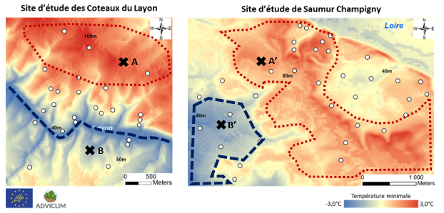 Il est parfois difficile d’expliquer les différences de comportement de la vigne au sein d’une appellation, d’une commune ou même d’une parcelle. Cela peut être lié à différents facteurs, notamment le sol et le climat. Pour ce qui est du sol, de sa composition en surface et en profondeur, les résultats des études terroir menées depuis 2000 (accessibles via E-terroir sur Techniloire.com depuis 2012) nous apportent un certain nombre de réponses avec une description détaillée des horizons rencontrés, les conséquences engendrées sur la vigne (contrainte d’enracinement, potentiel de vigueur, etc…), et quelques préconisations d’adaptation (type de porte-greffe le plus adapté par exemple). Mais cela n’explique pas encore tout…Reste désormais la variabilité du climat à étudier ! D’ailleurs, on pourrait même parler de « microclimat », puisque bien souvent, des différences sont observées à quelques dizaines de mètres d’écarts (zones sensibles au gel, couloirs de vents, précipitations localisées, etc…). Les études « zonage climatique à échelle fine » ont pour objectif de cartographier cette variabilité sur un territoire donné (appellation ou commune), pour une résolution de l’ordre de l’hectare, et ce à un instant T. Cela permettra de mieux appréhender le terroir viticole étudié.