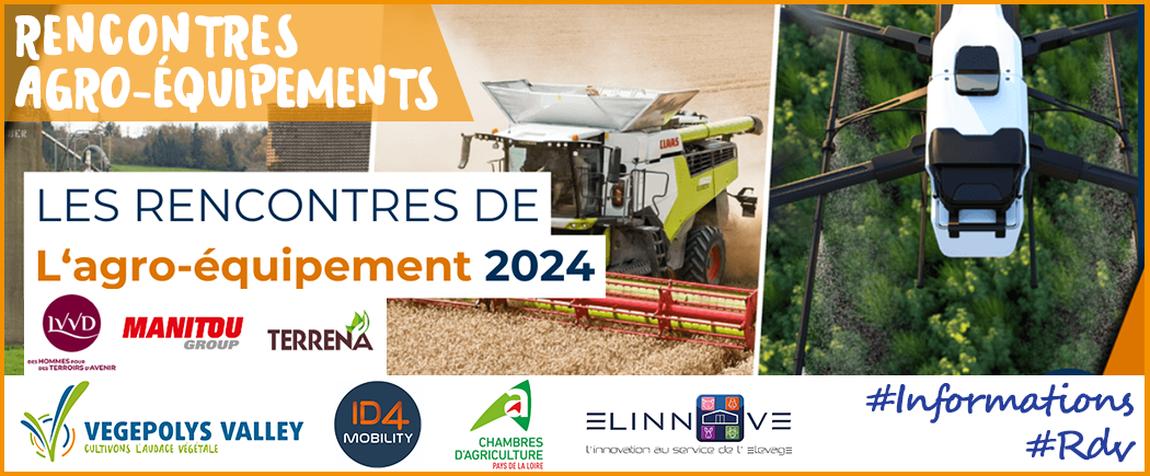 Les Pôles ID4MOBILTY et VÉGÉPOLYS VALLEY, le cluster ELINNOVE, et La Chambre d’Agriculture Pays de la Loire organisent le 30 mai prochain, en partenariat avec Terrena et Manitou, la 7ième édition des « Rencontres de l’agroéquipement », journée d’information, d'atelier et de visites. Venez rencontrer vos partenaires de l’agroéquipement lors de cette journée qu’ils soient intégrateurs agro-équipementiers, fabricants de machines spéciales, utilisateurs / producteurs dans les filières végétales et animales ou acteurs de la Recherche et de la Formation.