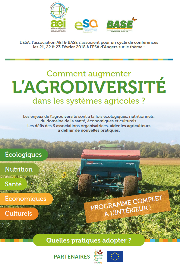 L'ESA, l'association AEI & BASE s'associent pour un cycle de conférences les 21, 22 et 23 février 2018 à l'ESA, Angers. Les enjeux de l'agrodiversité sont à la fois écologiques, nutritionnels, du domaine de la santé, économiques et culturels. Les défis des 3 associations organisatrices, aider les agriculteurs à définir de nouvelles pratiques. Au programme :