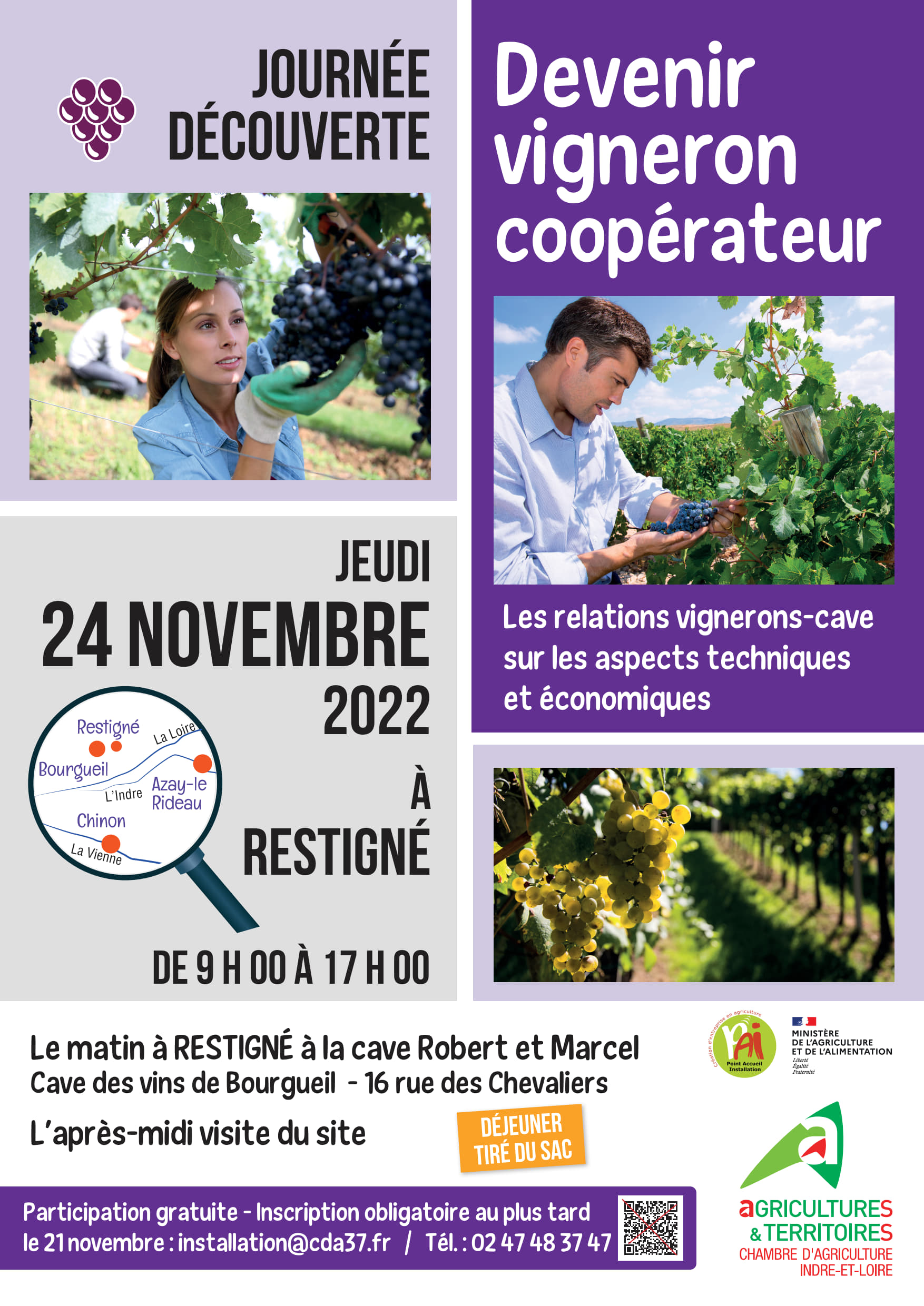 Une journée découverte est organisée par la Chambre d’agriculture d’Indre-et-Loire, en partenariat avec la cave coopérative Robert et Marcel.  Cette journée s’adresse aussi bien à des porteurs de projets souhaitant reprendre une exploitation qu’à des vignerons déjà installés souhaitant se renseigner sur le système coopératif.