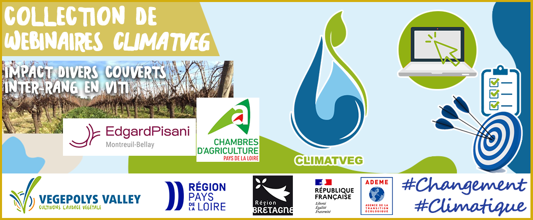 Dans le cadre du projet CLIMAVEG, portant sur la transition et la durabilité des systèmes de productions végétales face aux changements climatiques, le pôle de compétitivité Végépolys Valley a concocté avec les pilotes d'action une collection de webinaires afin de mieux connaître les résultats des différentes actions du projet.Thomas Chassaing (Chambre d'agriculture des Pays de la Loire) et Laurent Dutruel (EPLEFPA Edgard Pisani) présenteront lors de cette vidéoconférence, le 9 décembre 2024, des leviers d’adaptation face au changement climatique en systèmes viticoles et en particulier l'impact de différentes conduites d’entretien du couvert inter-rang.