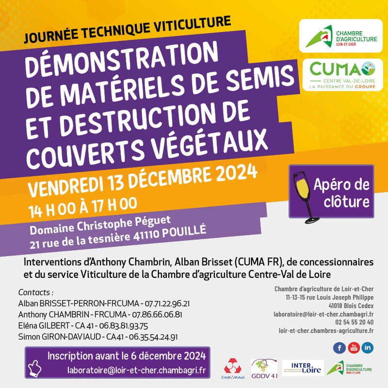 Le vendredi 13 décembre 2024, le service viticulture de la  Chambre d'agriculture Centre Val de Loire en partenariat avec la FRCUMA et divers concessionnaires organise une démonstration de Matériels de semis et destruction de couverts végétaux au domaine Christophe Péguet, Pouillé (41).