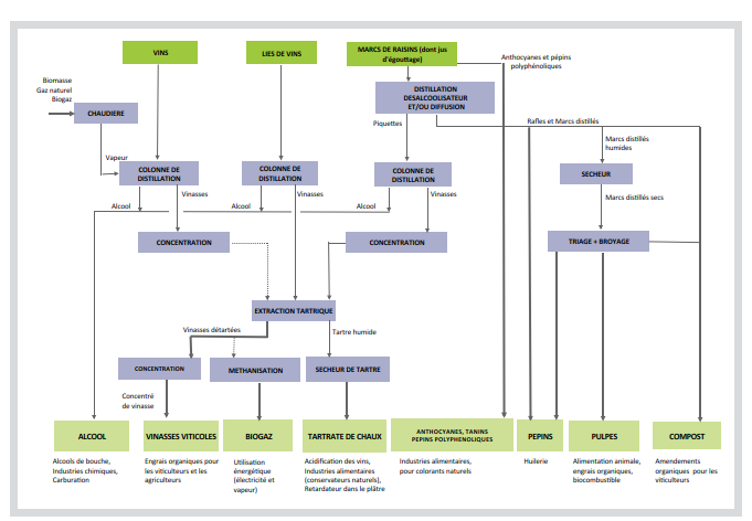 Les distilleries vinicoles s’inscrivent dans une économie circulaire en collectant et recyclant les marcs de raisins, les lies de vin, les bourbes et les vins en de nombreux co-produits commercialisés (voir ci-dessous dans différents secteurs comme l’agriculture, la viticulture, l’élevage, l’agro-alimentaire, l’énergie, l’industrie cosmétique et chimique). Leur valeur marchande est propre à chaque coproduit commercialisé, en fonction de son marché. Dans la majorité des cas, du fait des aides à la collecte et à la transformation, pour le vigneron, le transport et la valorisation des sous-produits de la vinification se font à coût zéro. Lorsqu’un coût est facturé, il est déterminé par les distilleries et varie en fonction des régions et des campagnes de 21 à 26 euros par tonne de marc de raisins. D’un point de vue environnemental, l’importante consommation d’énergie du fait du processus technique lui-même est l’axe d’amélioration majeur. Différentes solutions existent pour optimiser le bilan énergétique des distilleries : modernisation et optimisation des infrastructures, intégration de la méthanisation dans le processus de distillation afin de produire du biogaz, mise en place de chaudière biomasse.