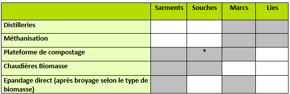 Tableau 4 : Voies de valorisation autorisées par type de biomasse vitivinicole